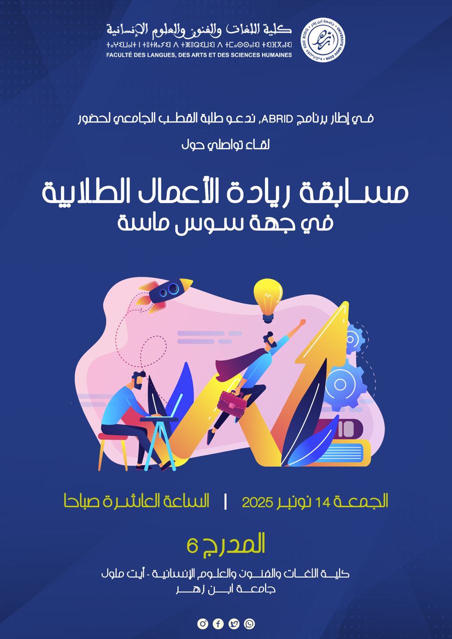 في إطار برنامج ABRID، ندعو طلبة القطب الجامعي أيت ملول لحضور لقاء تواصلي حول :"مسابقة ريادة الأعمال الطلابية في جهة سوس ماسة".