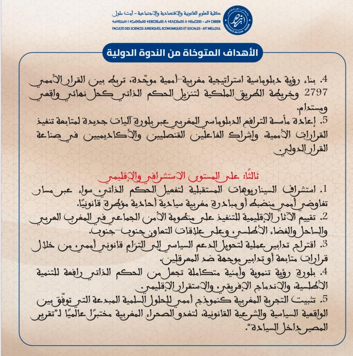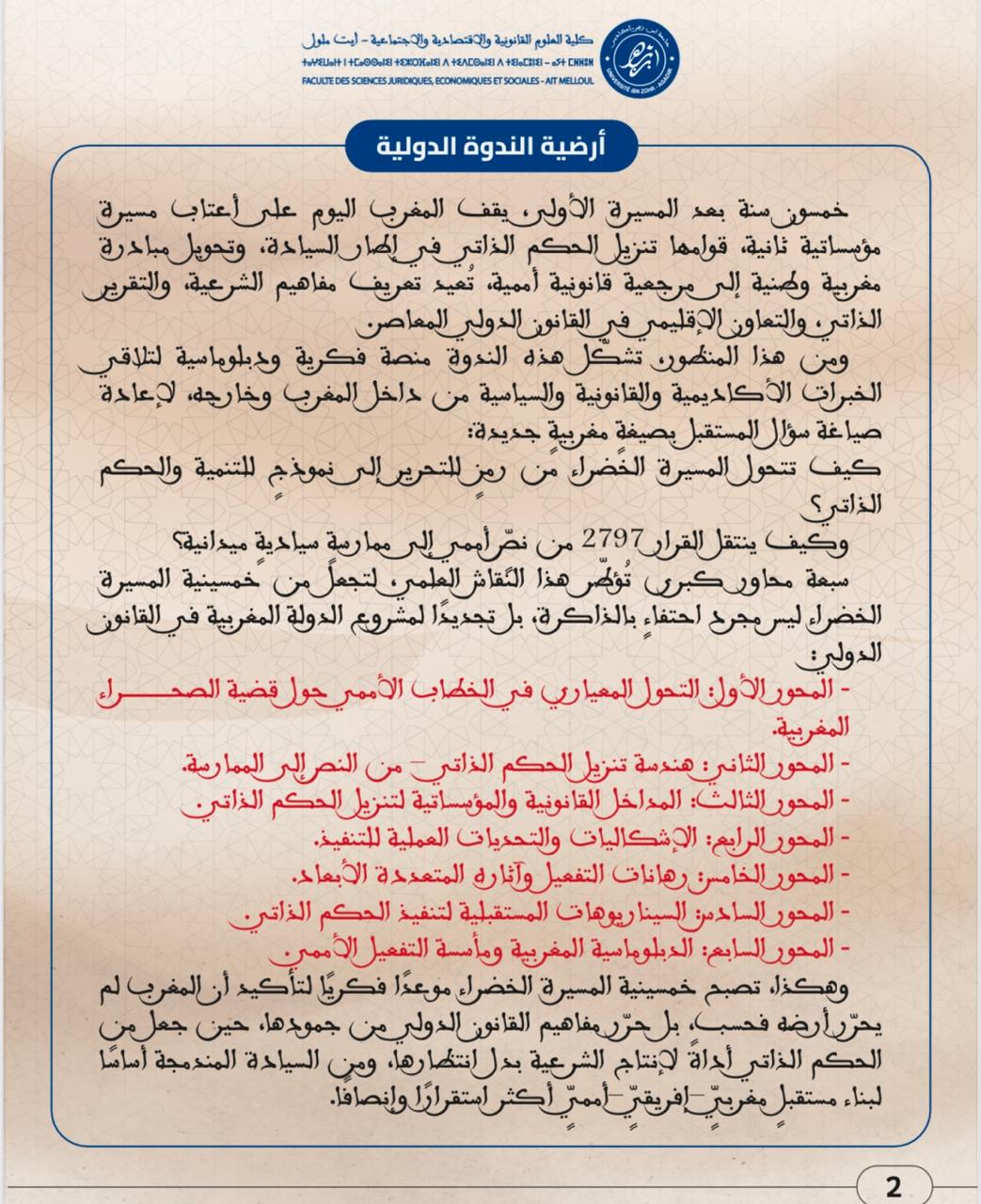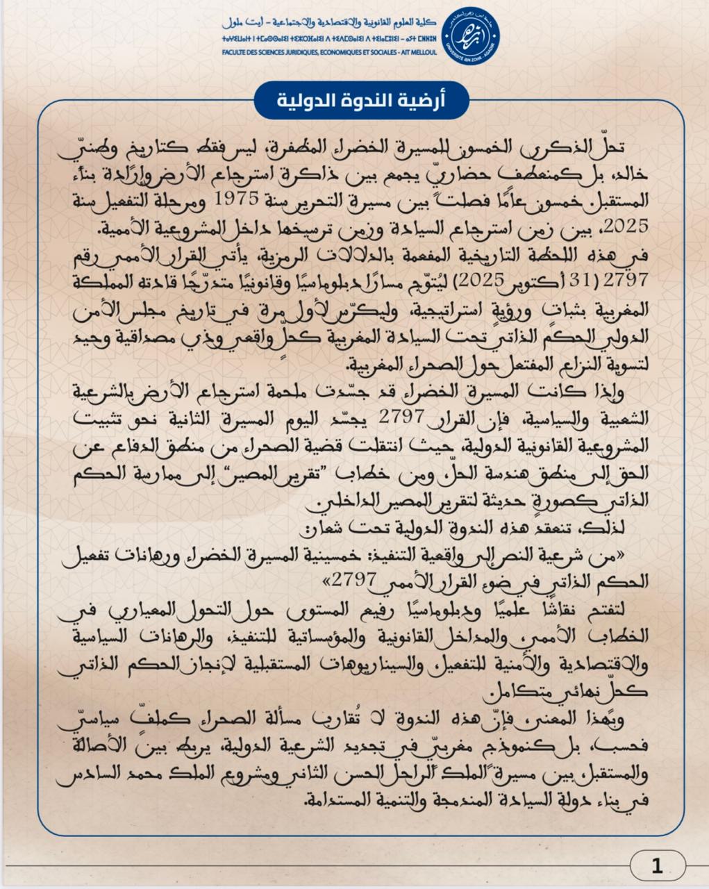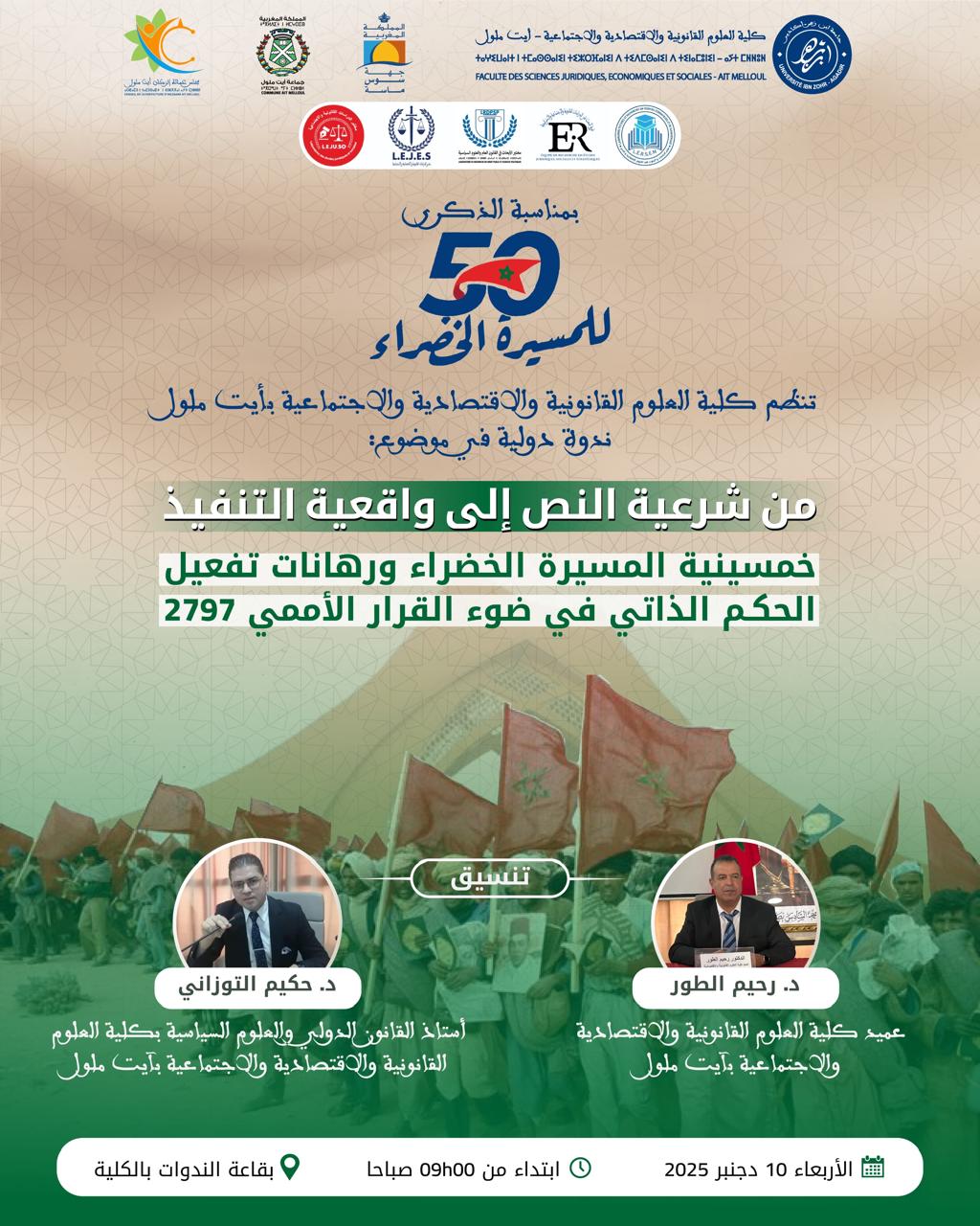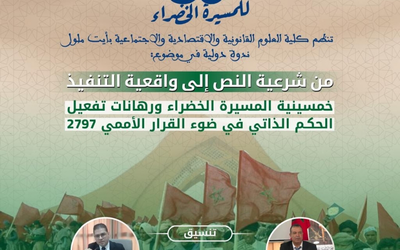 ندوة دولية في موضوع : من شرعية النص إلى واقعية التنفيذ خمسينية المسيرة الخضراء ورهانات تفعيل الحكم الذاتي في ضوء القرار الأممي 2797