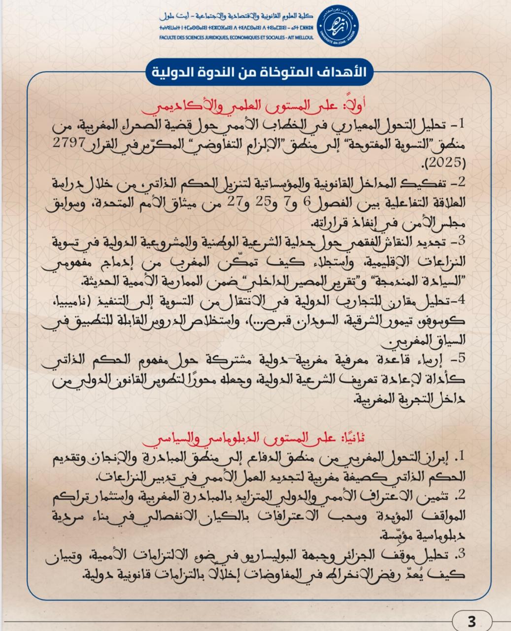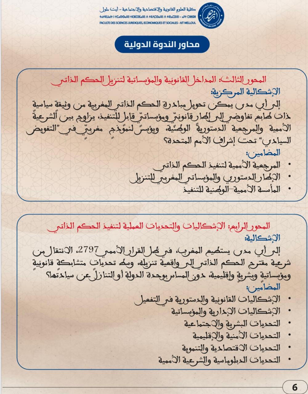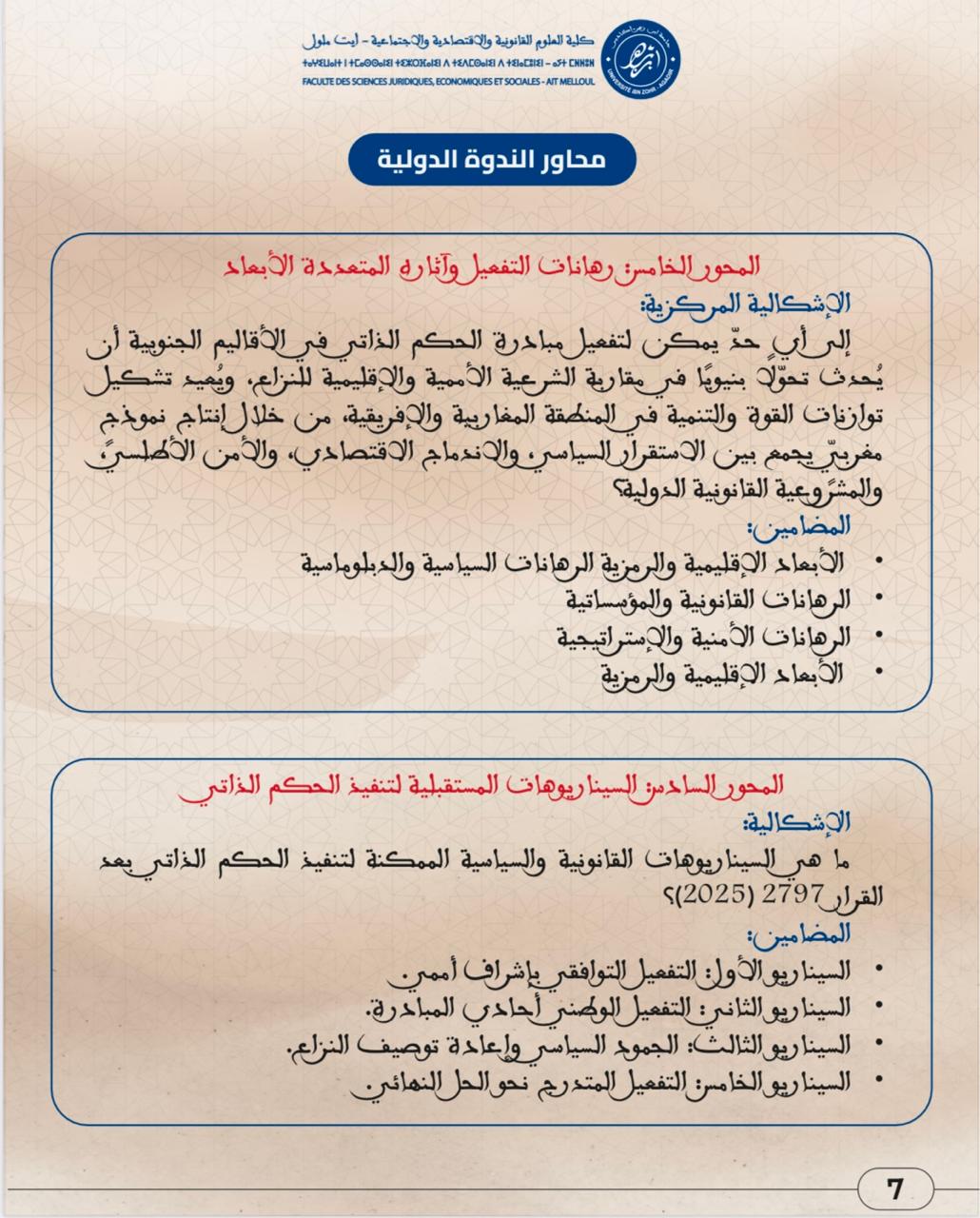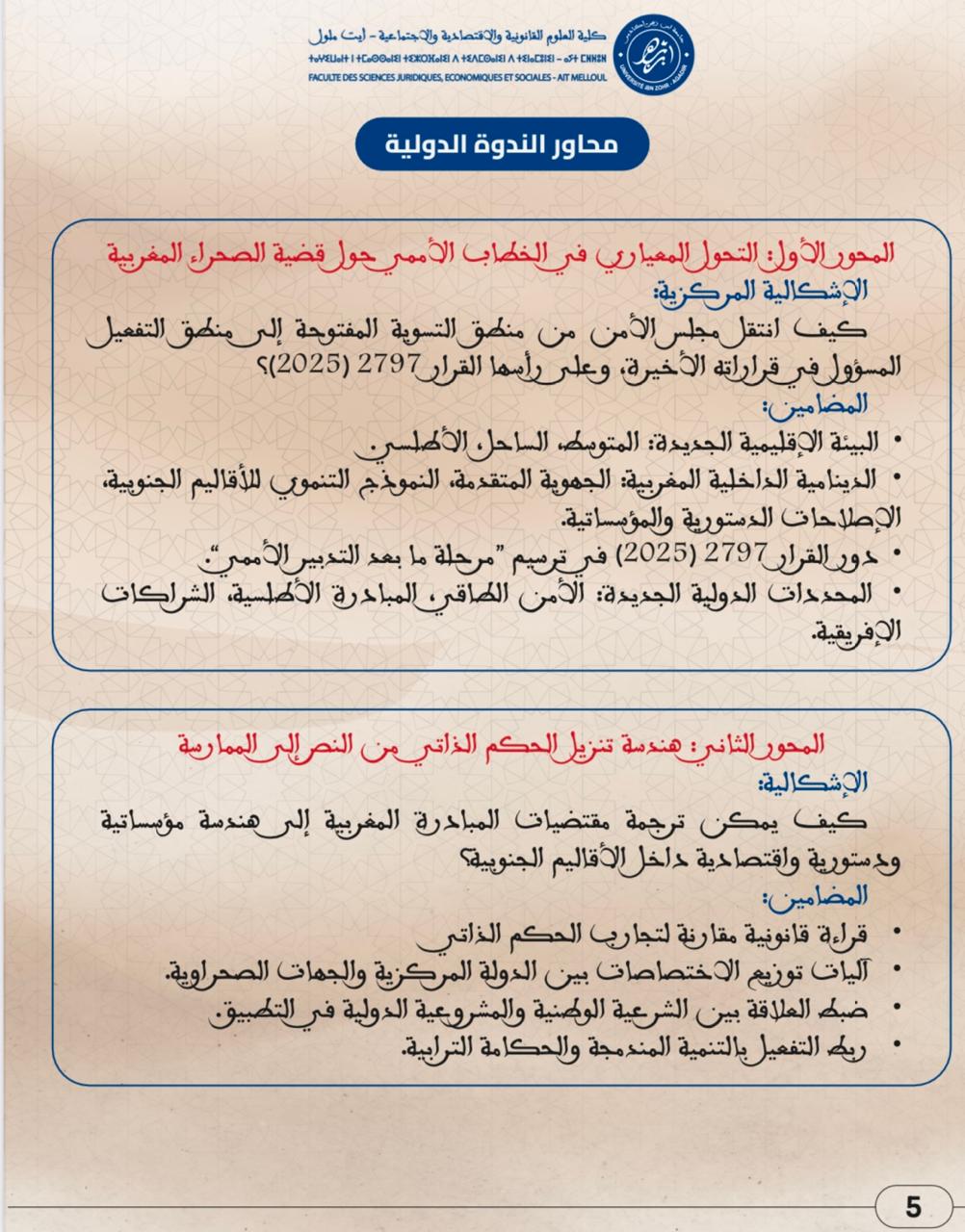 ندوة دولية في موضوع : من شرعية النص إلى واقعية التنفيذ خمسينية المسيرة الخضراء ورهانات تفعيل الحكم الذاتي في ضوء القرار الأممي 2797