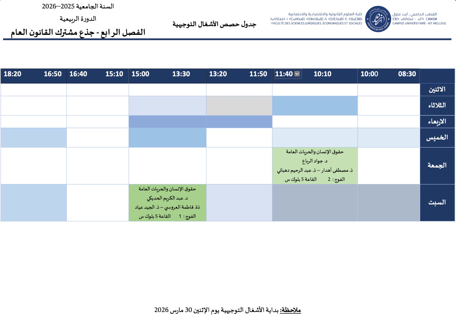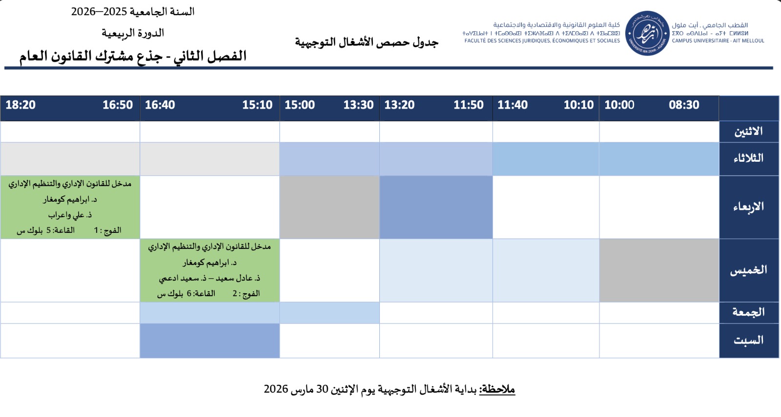 جدول حصص الأشغال التوجيهية – شعبة القانون العام